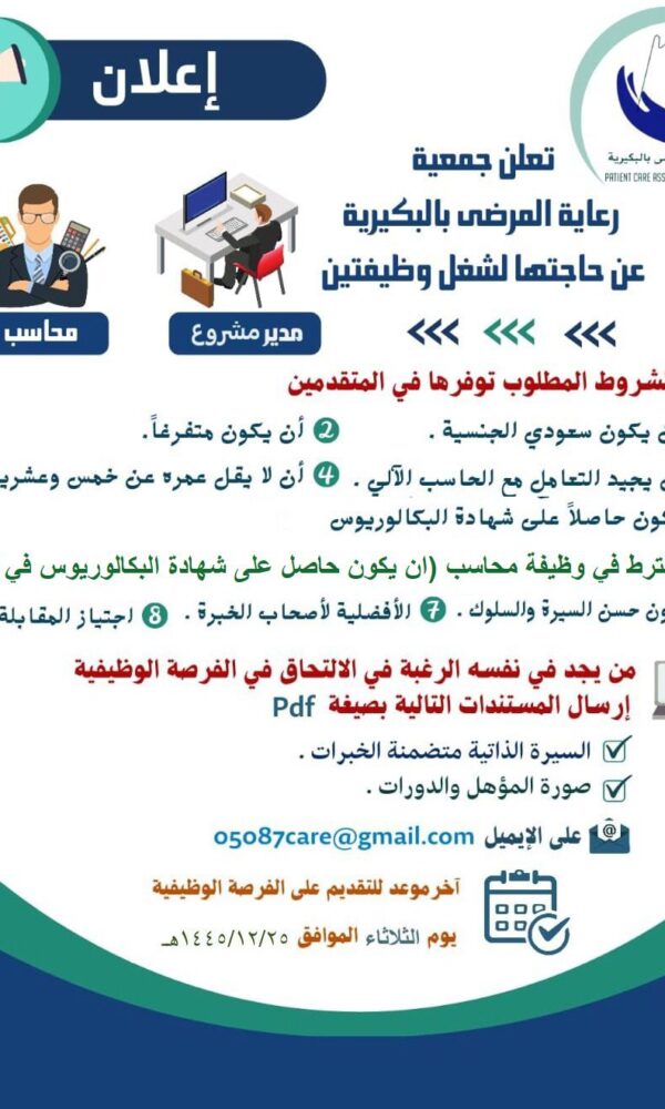إعلان عن وظائف شاغرة في جمعية رعاية المرضى بالبكيريةمحرر الموقع8 يونيو، 2024تعلن جمعية رعاية المرضى بالبكيرية عن حاجتها لوظائف شاغرة ( مدير مشروع + ... اقرأ أكثر